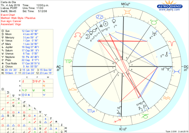 É com a força criativa do Leão que hoje afirmamos os nossos desejos de fomentar uma nova segurança emocional, doméstica ou nacional, mesmo que isso represente rupturas com a tradição ou com o estado existente das coisas. Somos impelidos a falar e a agir para compensar velhas carências pela conjunção de Lua, Mercúrio e Marte em Leão, em trígono a Quíron em Carneiro, aspectos em signos de Fogo que exigem acção criativa. Essas energias reflectem-se naquilo a que chamaremos “casa”, onde encontramos segurança e o conforto do que nos é querido seja em família seu noutras circunstâncias que nos têm satisfação emocional. É Vénus, o Sol e o Nódulo Norte em Caranguejo que nos fazem olhar para dentro, para o intimo, para o familiar e securizante e com a Lua seu regente em Leão conjunta a Marte e Mercúrio tornado-nos os defensores das nossas próprias causa de existência. Avançamos assim com empenho e mesmo algum dramatismo para o projecto de futuro, iluminado no eclipse de há poucos dias, e que obriga a rupturas profundas com a ordem existente, já caduca e a necessitar de ser reformulada, sinais dados pela presença do Nódulo Norte em Caranguejo e do Nódulo Sul conjunto a Saturno em Capricórnio. Um sextil de Neptuno a Saturno e o seu trígono ao Nódulo Norte indicam a forte componente ideológica ou de sonho e fantasia que guia todos os passos de avanços e rupturas que estamos a dar. O que é preciso ter em conta é que a partir de segunda feira próxima e até à Lua Nova de 1 de Agosto, Mercúrio vai estar retrógrado voltando do Leão para o Caranguejo e chegando a fazer oposição a Plutão em Capricórnio. Isto quer dizer que muito do que for afirmado com veemência daqui até segunda feira, provavelmente vai ter de ser sujeito a revisão e correcção, em particular a seguir à Lua Cheia e eclipse da Lua no próximo dia 16. Estudar bem o que se pretende defender, afinar a lógica da vontade e não esquecer os detalhes relevantes a preencher ajudam desde já a ter que recuar menos nas posições tomadas quando Mercúrio andar para trás.