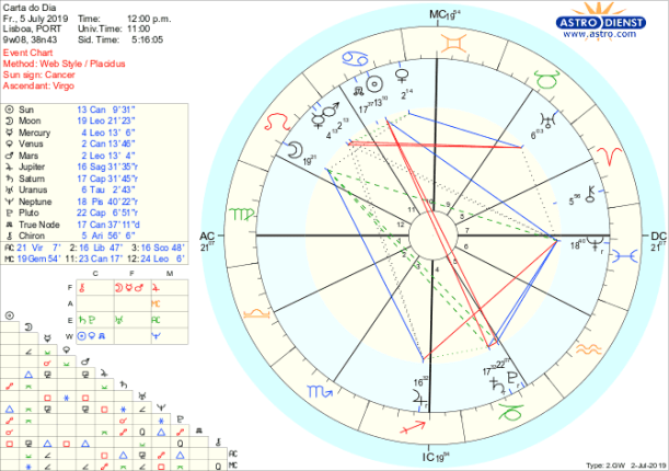 As emoções do dia são um carrossel acelerado em que saltamos de um assento para outro à procura de maior estabilidade. A Lua em Leão exagera o sentido de identidade, dramatiza as emoções e isto é amplificado por um trígono a Júpiter em Sagitário, frustrado por uma semi-quadratura a Vénus, fonte de tensão pelos quincúncios a Saturno, Plutão e Neptuno, e um verdadeiro dedo na ferida pelo sesquiquadrado a Quiron. A acrescentar à agitação temos uma quadratura entre Urano em Touro e Mercúrio em Leão que exalta a dificuldade de comunicarmos com razoabilidade o que pretendemos, mais ainda porque Marte também faz parte do aspecto por estar conjunto a Mercúrio. Podemos julgar que resolvemos velhas feridas com essa comunicação explosiva ou com saltos de humores e valores dado o trígono a Quíron de Marte e Mercúrio mas é apenas destabilizador com o Sol em Caranguejo já na órbita de oposição a Saturno, Nódulo Sul e Plutão em Capricórnio. Para compensar tudo isto temos um aspecto amenizador que é o do sextil de Vénus em Caranguejo a Urano em Touro: bem no íntimo há o desejo e a capacidade de mudar para garantir o bem estar e segurança emocionais de que tanto dependemos.