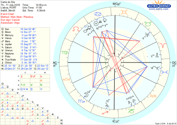 Correm fortes hojes as emoções com impulsos de controlo dos processos e protecção dos interesses assim como a convicção de que estamos a seguir um qualquer ideal, com a Lua em Escorpião num grande trígono de Água ao Sol e Nódulo Norte em Caranguejo e a Neptuno em Peixes. Tudo correria bem não fosse a quadratura da Lua a Marte em Leão e oposição a Urano em Touro, pela manhã, envolvida na quadratura todo o dia de hoje e amanhã de Marte a Urano. Estas quadraturas podem traduzir-se num impulso excessivo do exercício de vontade cega, para satisfazer carências – com Marte em trígono a Quiron em Carneiro – mas os resultados podem não ser os melhores e provocar incidentes, acidentes e impactos impensáveis. Apenas o sextil da Lua a Saturno e Plutão assim como a conjunção de Saturno ao Nódulo Sul nos dão sinais de que para termos força real para mudar o que tem de ser mudado, não podemos disparar em todas as direcções egocêntricamente respondendo à força da quadratura de Marte a Urano. Pelo contrário, há que estar atento a oportunidades de reorganizar a vida de forma pragmática, partilhando com outros o amor por criar novas raízes e bases de segurança física e emocional, casa, familia, tradições, com a ajuda do sextil de Vénus em Caranguejo a Urano em Touro. Mercúrio retrógrado em Leão conjunto a Marte também nos obriga a repensar a lógica pessoal de resposta a todos os desafios.
