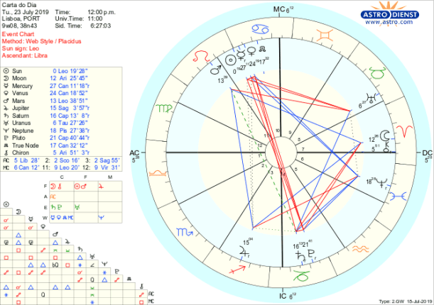 Não é preciso discutir ou resistir mas sim, sem receios tomar as iniciativas necessárias para repor a ordem e segurança que precisamos nas nossas vidas e com quem as partilhamos, em casa ou no mundo. A energia é grande e a capacidade de execução também com um trígono de Marte em Leão a Júpiter em Sagitário, tudo exacerbado pelo desejo de acção vindo do grande trígono que fazem com a Lua em Carneiro. Como o Sol acabou de entrar em Leão, é na plena consciência de quem somos que temos de nos afirmar, criativa, amorosamente e em confiança. No entanto, não podemos estar num pedestal de certezas e orgulho. Vem aí uma quadratura do Sol a Urano em Touro, exacta dentro de uma semana, e isso implica flexibilidade senão corremos o risco de rupturas dolorosas. O que este trânsito que se avizinha pede é que desde já estejamos abertos a mudanças, a novos valores para apreciar, adoptar, investir. Mas esta transformação não é só exterior, passa também pela aceitação de que o nosso sentido de individualidade pode mudar. Não temos de ser sempre a mesma pessoa, agarrados ao mesmo ego. A evolução é possível e o que demonstrarmos ser capazes de concretizar esta semana graças aos trígonos de Fogo é o que vai incendiar a transformação e a inovação do projecto pessoal.
