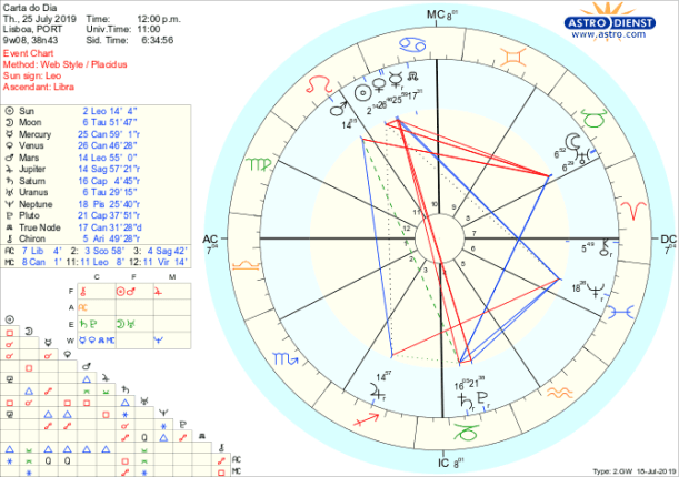 É a Lua que de manhã faz conjunção a Urano em Touro, no que provoca uma qualquer estabilização de rotinas ou valores o que nos obriga a repensar quem somos e o que queremos, dada a quadratura ao Sol em Leão que vai perdurar até ao final da semana. Mas, de seguida, a Lua avança para um sextil ao Nódulo Norte em Caranguejo e um trígono a Saturno em Capricórnio e tudo volta a fazer sentido, um novo sentido, uma nova ordem, um novo destino de segurança emocional, familiar, nacional. O trígono exacto de Marte em Leão a Júpiter em Sagitário simboliza o entusiasmo e facilidade com que vamos poder progredir no rumo que hoje re-traçarmos. De facto estamos a trabalhar questões pendentes com Mercúrio, Júpiter, Saturno e Plutão retrógrados e são no fundo avanços sobre assuntos em atraso que estamos a conseguir estabelecer neste período em que finalizar da forma mais correcta e progressista o que ficou para trás é o melhor a fazer.