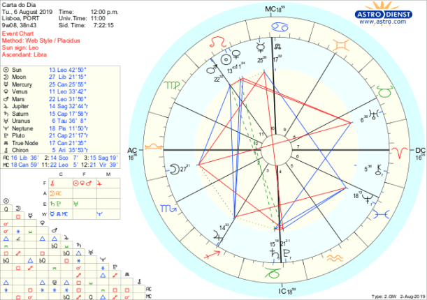 Na primeira metade do dia, apesar dos esforços de manter a paz, a justiça das relações ou as contas equilibradas é difícil evitar o conflito entre o que seria lógico defender e o impulso para apaziguar as situações, com a Lua em Balança em quadratura a Mercúrio em Caranguejo e o Sol em Leão em trígono a Júpiter em Sagitário a exacerbar toda o força do ego, mais ainda pela presença de Vénus e Marte também em Leão e igualmente em aspecto de trígono a Júpiter mas não exactos. Somos o que somos, queremos o que queremos, desejamos o que desejamos e de preferência que todos estejam de acordo connosco. Mas esta atitude auto-centrada rapidamente é perturbada pela consciência de que não só não temos o controlo total como há imprevistos que ainda podem abalar mais o sentido de poder que queremos assumir sobre tudo e todos. Essas ameaças ao controlo que pretendemos ter das situações – e do qual depende a segurança emocional – começam a surgir pela tarde com a entrada da Lua em Escorpião e avançam para que, na madrugada de quarta feira, a sua oposição a Urano em Touro nos surpreenda com a necessidade de mudarmos de valores e abrirmos mão de certas defesas. É assim um dia em que o orgulho ou narcisismos podem ser abalados por factores externos que exigem alguma humildade e flexibilidade. O que não estiver alinhado com valores generosos e criativos vai acabar por sofrer correcção…
