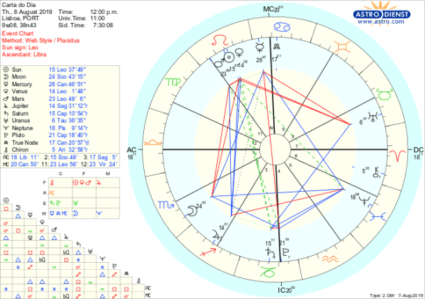 Como pano de fundo temos duas forças contraditórias nos Céus de hoje: por um lado os planetas em Leão e o seu trígono a Júpiter em Sagitário acendem todas as chamas do individualismo, exercício da vontade, orgulho e paixão, mas também da criatividade, generosidade e ilustração da Verdade . Por outro, o quincúncio dos planetas em Leão a Saturno em Capricórnio e a Neptuno em Peixes revela claramente que não pode haver descuido das regras e da ordem nem podemos ir atrás de fantasias. E, enquanto insistirmos em seguir apenas desejo e emoções e nos deixarmos controlar por elas, com a Lua em Escorpião em trígono a Mercúrio em Caranguejo, entramos em conflitos, tanto internos como externos. Pelo final do dia a Lua entra em Sagitário e faz semi-quadratura a Saturno e de seguida a Plutão e sentimos na pele que nem durante o dia correu bem ir atrás das emoções como pela noite não dá bom resultado ir atrás de grandes ideias nem ter excessos de optimismo. Há que gerir o dia com intenção criativa, positiva mas sempre atentos aos impactos.