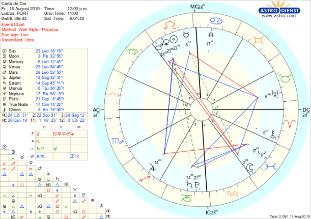 Pensamos que sabemos mas acabamos por ser surpreendidos hoje por outras perspectivas ou novos valores, a que com sensibilidade e compaixão temos de dar ouvidos, com Mercúrio em Leão em quadratura a Urano em Touro e em quincúncio à Lua em Peixes. Apesar do Sol, Vénus e Marte em Leão serem uma tentação para a arrogância, orgulho ou qualquer outro excesso de ego, o facto é que há que ser flexível e estar aberto a informações que alterem a percepção e nos levem a mudar de postura. Isto não quer dizer posições moles, antes pelo contrario, um trígono de Vénus a Eris em Carneiro alia a beleza e o conflito e encoraja-nos a lutar pelo que amamos, desde a cor com que pintar a parede até à paixão do coração. Mas essa defesa do que nos move tem também ela descer flexível porque o que era válido ontem pode não ser já válido hoje. O biquintil de Júpiter em Sagitário a Urano em Touro diz-nos que é com inteligência e criatividade que devemos aproveitar a mudança de circunstâncias e perspectivas.