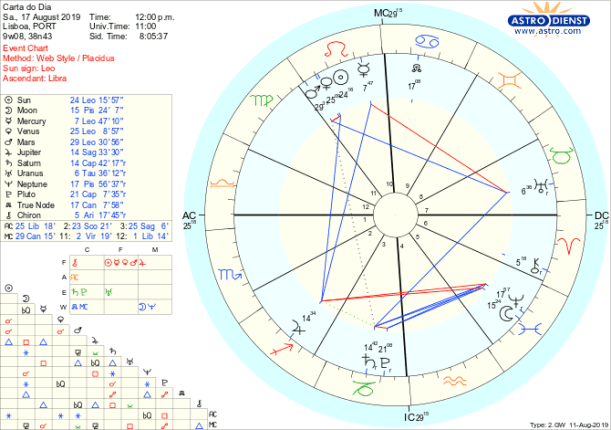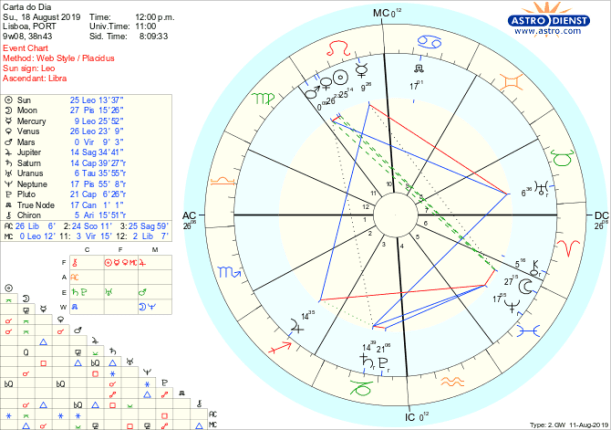 O que marca a diferença entre sábado e domingo é passagem de Marte em Leão para Marte em Virgem, fazendo conjunção à estrela fixa Regulus que desde 2012 saiu de Fogo para Terra, do domínio do Leão para o serviço de Virgem, do orgulho ou criatividade para o sentido critico e atenção ao detalhe. Nas próximas semanas também Sol, Vénus e Mercúrio vão fazer essa transição de signo e conjunção a Régulus e seremos chamados a continuar essa mudança de atitude tanto individual como colectiva, da afirmação da identidade para a dedicação prática a causas que a todos sejam úteis. Assim, enquanto sábado podemos dar passos concretos para realizar o que projectamos, a partir de domingo a acção torna-se muito mais precisa e já a beneficiar da nova orientação dada pelo trígono da próxima semana de Marte a Urano em Touro. Estamos a fazer o que é preciso, a fazer melhor e a fazer diferente.