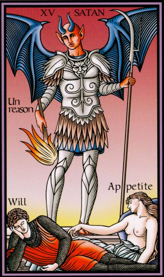 Longe vão já os tempos em que a figura apenas se referenciava ao maligno ser bíblico, fonte de tentações e malevolência. Na própria Bíblia, Lúcifer era o portador da luz. Anjo caído, passou a estar associado à sombra. Ora, o Diabo do Tarot não é luz nem sombra, é antes a essência duma força interior que sai a terreiro, não para confrontar, mas para se exprimir com autenticidade e audácia. O Diabo é leal a si mesmo e presta contas, também a si mesmo. Certo, pode não ser compreendido. Certo, pode até ofender outros, pelas suas atitudes. Mas isso são decorrências do inconformismo, não ataques directos.