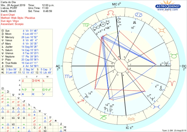 São favoráveis os Céus hoje a investimentos novos e a trabalhos em que apliquemos novas tecnologias de forma a fazer do velho novo e satisfazer a necessidade de acção e amor pela organização. Sol, Marte e Vénus continuam em trígono a Urano em Touro, aproximando-se de um trígono a Saturno, em aspectos de concretização de projectos em que inovar deve ser o objectivo. Um qguincúncio dos planetas em Virgem a Quiron em Carneiro e o um trígono deste à Lua em Leão mostra como é importante neste processo ultrapassar velhas feridas incapacitastes e mostrar quem somos e do que somos capazes. Mais ainda, um trígono da Lua a Júpiter em Sagitário permite-nos voar alto nessa afirmação de identidade e escolhas. É preciso apenas ter atenção à forma como comunicamos- já que o discurso egocêntrico de Mercúrio em Leão choca em sesquiquadrado com limites e restrições pré-existentes de Saturno e Marte em Vénus embatem também em sesquiquadrado com Plutão o que pede cuidados e flexibilidade para conseguir metamorfoses.