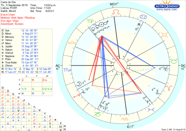 Todos os trabalhos de precisão, análises cuidadas, a reorganização de informação e a definição inteligente de um método a seguir no serviço ou na saúde são hoje e amanhã particularmente favorecidos por um trígono de Sol e Mercúrio em Virgem a Saturno retrógrado em Capricórnio. De facto, a lógica e a disciplina estão alinhadas para nos permitir resolver equações práticas que traduzam as expectativas de segurança pessoal que a Lua em Sagitário e o Nódulo Norte em Caranguejo estimulam. Vamos apreender dados e informações que nos trazem maior clareza de propósito e é com o optimismo da Lua em Sagitário em trígono a Quiron em Carneiro que ultrapassamos velhas frustrações ou carências vindas da incapacidade de acção. Marte, regente do Carneiro, também em Virgem a um grau do Sol e a três graus de um trígono exacto a Saturno permite agir com precisão clínica e obter resultados duradouros. Mãos e mente à obra!