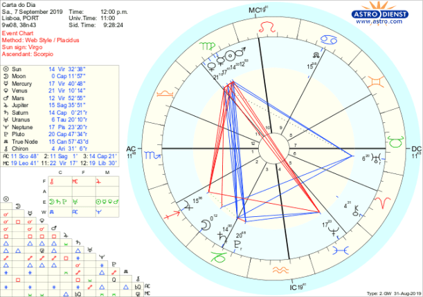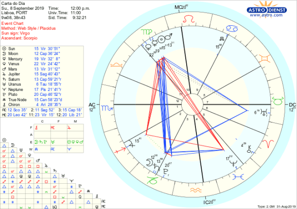 Todo o fim-de-semana é para, ambiciosa e organizadamente, nos prepararmos para metamorfoses positivas na ordem das coisas, em casa, no trabalho, na saúde ou na política, a desenvolver a partir da segunda metade de Setembro e às quais nos devemos dedicar até lá, com perseverança e a certeza de que é com um passo de cada vez que percorreremos todo o caminho. Tanto sábado como domingo a Lua está em Capricórnio de onde faz trígonos a Urano em Touro e a Marte, Sol, Mercúrio e Vénus em Virgem, que por seu lado estão em sextil ao Nódulo Norte em Caranguejo que a Lua rege. Estes aspectos de concretização, materialização, aplicação e trabalho cuidado a pensar no longo prazo têm como objectivo atingirmos novos patamares de estabilidade e segurança para tal temos de largar velhas estruturas em que nos apoiávamos e lançarmo-nos numa aventura calculada de criar o novo, com a Lua no domingo conjunta a Saturno e ao Nódulo Sul, em trígono ao Sol e a Marte em Virgem. Para nos inspirar – e não para nos iludir- está Neptuno em Peixes em oposição a Mercúrio que rege a Virgem e para nos dar ânimo – apesar de termos de ter cuidado em não exagerar- está Júpiter em Sagitário em quadratura aos planetas em Virgem e em semi-sextil a Saturno. É um fim-de-semana para nos dedicarmos a tratar de assuntos de casa, saúde, família, trabalho, política a pensar no longo prazo e não na satisfação imediata. A perseverança será recompensada!