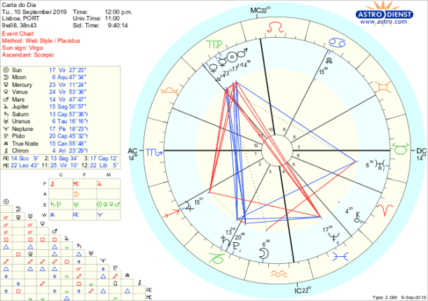 Somos apanhados de surpresa, sujeitos a situações novas e temos de ajustar-nos ao que não estava na agenda mas também é possível que o desejo de apoio não seja satisfeito e que algo ou alguém nos enerve e dê vontade virar costas. No entanto, o bom senso e sentido prático do trígono dos planetas em Virgem aos planetas em Capricórnio pode prevalecer e contrabalançar a quadratura da Lua em Aquário a Urano em Touro. A chave está em discernir o real do imaginário e harmonizar sentido crítico e determinação com sentidos difusos do que seria o ideal com os planetas em Virgem em oposição a Neptuno em Peixes: só assim conseguimos tornar o ideal real o que também é uma chamada de atenção para não sermos apenas matemáticos mas para vermos a beleza das equações. O problema está no eco que procuramos às metamorfoses dos últimos dias. Insuficientes ou excessivas, excessivas, estamos num dia de ajustamento entre a maneira como nos projectamos e novos valores que têm de fazer parte do pacote.