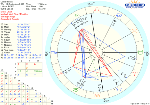 Ter grandes sonhos, dar pequenos passos certeiros no caminho da casa, familia, segurança emocional que com que aspiramos estar inseridos numa comunidade, e fazer ouvir a nossa Verdade é o que facilitam hoje os astros com Neptuno oposto a Marte e ao Sol e quadrado a Júpiter e Marte, em Virgem em sextil ao Nódulo Norte em Caranguejo que a Lua em Aquário rege e está em semi-sextil a Neptuno e a Plutão e quincúncio ao Sol em Virgem. Urano em Touro ainda em trígono a Marte em Virgem ajuda a fazer diferente porque nos revela o que já não tem valor. Com Plutão em trígono a todos os planetas em Virgem, há que ir ao fundo do que tem de mudar, incluindo das nossas próprias zonas de sombra para que a Verdade exterior seja igual à interior. Mas será preciso esperar por Janeiro, pela conjunção de Saturno a Plutão e a presença de Sol, Mercúrio e Júpiter em Capricórnio para que muito do que está a ocorrer esta semana se transforme de facto numa forma de organização de vida ou de sociedade.