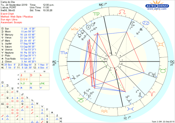 A tendência é para tentar chamar a atenção nas relações, mostrar do que somos capazes e fazer a diferença. A dificuldade é em sermos apreciados emocionalmente e entendidos verbalmente apesar da profundidade do diálogo. É a Lua em Leão em sextil ao Sol em Balança que nos leva a ser o palco das atenções nos relacionamentos ou contractos, puxando pelos galões e procurando afirmar valores novos pelo sextil da Lua a Urano em Touro. Mas Vénus e Mercúrio também em Balança estão quadrados respectivamente a Saturno e a Plutão em Capricórnio o que esfria as respostas sentimentais e dificulta ou traz conflitos nas discussões, como se houvesse um muro de regras, limites e forças maiores que impedissem a expressão dos afectos e da lógica. Outro problema é o quincúncio de Mercúrio a Neptuno em Peixes que baralha os dados, confunde o entendimento e tinge de fantasia muito do que queremos dizer e tudo isto se complica com a quadratura de Mercúrio a Júpiter em Sagitário que torna tudo ainda mais especulativo. Mas se estes são os perigos, podem também ser vias de solução desde que apanhemos a boleia do sextil de Saturno e Plutão a Neptuno e com um foco tremendo demos forma ao sonho, dialogando e estabelecendo relações equilibradas, vendo o potencial máximo e os limites mínimos e navegando construtivamente e em diálogo no processo.