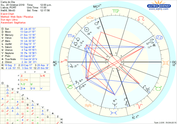 A conjunção, domingo de manhã, da Lua ao Nódulo Norte dá-nos um vislumbre do que desejamos atingir e que somos capazes de defender com paixão, graças ao trígono a Vénus em Escorpião. Nada se faz sozinho e os equilibrios de poder estão em fase crítica de revisão depois da quadratura do Sol em Balança a Plutão em Capricórnio no início da semana e antes que o Sol entre em Escorpião no arranque da próxima semana em Lua Nova, o início de um ciclo lunar e solar de regeneração e de controlo do que realmente nos interessa.