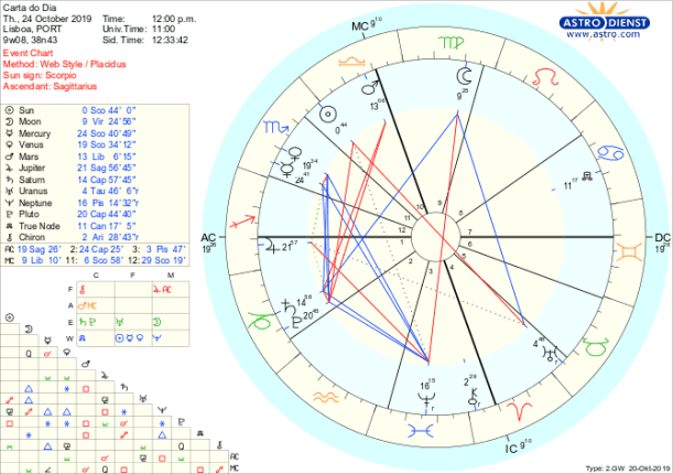 Estamos agora sob os raios do Sol em Escorpião ao qual se vai unir a Lua na próxima segunda feira e onde já se encontram Vénus e Mercúrio. Sentimos provavelmente o intensificar das emoções, a passionalidade da comunicação, a sensação de que tudo é questão de vida ou de morte e que nada pode ficar como tem estado, nem sequer as avarias de equipamentos que temos ignorado. Na agenda está ir ao fundo das questões e de nós próprios, restaurar inovando o que estiver nas nossas mãos e abrirmo-nos a valores até aqui neglicenciados porque se trata de renascer e de nos libertamos de velhos podres, padrões, dependências, obsessões, em prol de nova maneira de valorizar afectos e haveres, com o Sol desde já oposto a Urano em Touro e exacto na Lua Nova. Como os regentes de Escorpião Marte e Plutão estão respectivamente em Balança e em Capricórnio, torna-se claro que é mesmo no refazer de relações e da ordem em que estamos inseridos que temos de aplicar a nossa sabedoria e pragmatismo para não correr o risco de exageros nefastos. Somos ajudados hoje nesse sentido prático pelo trígono da Lua em Vénus a Urano em Touro e horas depois a Saturno em Capricórnio. Assim, através da dedicação e serviço, damos sentido e pomos ordem no mar de desafios e metamorfoses que estamos a ter de encarar. Encontrar estabilidade emocional, re-arrumar a casa, dar novo alento à família, novo rumo às tradições e alimentar o que é nosso ou nacional são alguns dos sentidos a dar às transformações profundas em curso, com o Nódulo Norte em Caranguejo em sextil à Lua em Virgem e em oposição ainda a Saturno em Capricórnio. Quando mais e melhor fizermos hoje, com mais atenção à possibilidade de inovar, ao detalhe, ao calendário e impactos a longo prazo, melhor aproveitamos os Céus do dia.