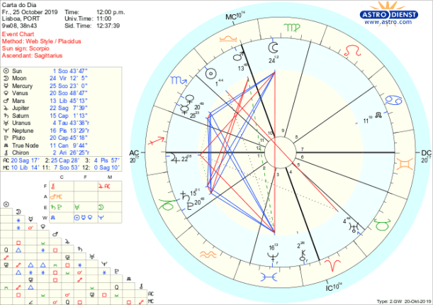 Mas hoje ainda não estamos nesse ponto de semear uma nova realidade, de renascermos das cinzas simbólicas do Escorpião e da noite da Lua Nova. Hoje ainda há muito que fazer, assuntos a tratar em detalhe, com sentido prático e noção de que há que ir ao fundo das questões para podermos criar uma nova ordem. Isto porque a Lua ainda está em Virgem a fazer sextis a Vénus e a Mercúrio e trígonos a Saturno e a Plutão em Capricórnio. Só pela noite entra em Balança num sinal de que depois de termos cuidado dos problemas a resolver de forma pragmática em Virgem, apesar dos sentimentos intensos suscitados pelas energias em Escorpião, temos agora de encarar o outro, as relações, os acordos, os contractos, aspirando a que haja paz e equlibrios entre o que damos e o que recebemos mas sentindo funda a ferida antiga do impacto das nossas acções com a Lua em oposição a Quiron em Carneiro quincúncio ao Sol em Escorpião, a levar-nos a interrogar se fizemos o suficiente ou se devíamos ter cortado mais radicalmente com o que não servia o nosso propósito já que Marte regente do Carneiro e do Escorpião se encontra em Balança em quadratura aos Nódulos Lunares. O sextil de Venus a Plutão é a garantia de que vamos ter oportunidades amplas – e passionais – de não deixar pedra por virar nos sentimentos, nas relações, na ordem em que queremos viver.