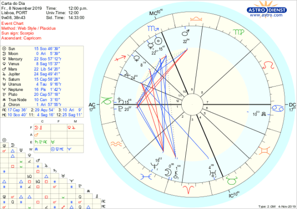 É hoje possível ter as iniciativas que há muito aspirávamos concretizar e que se vão traduzir num processo de reconstrução inovadora de algo em que acreditamos e em que estamos a fundo empenhados. A Lua entra em Carneiro pela tarde, faz conjunção a Quiron, semi-sextil a Urano em Touro, trígono a Vénus em Sagitário enquanto o Sol em Escorpião está em sextil exacto a Saturno em Capricórnio: todos óptimos aspectos para avançarmos no que nos move e que dependem nesta fase de alguma revisão da matéria e da lógica que dever guiar essa tentativa de controlo das situações sejam elas emocionais, financeiras ou de outra natureza.