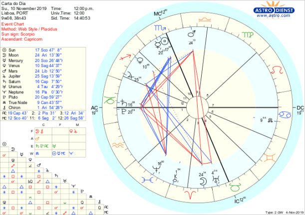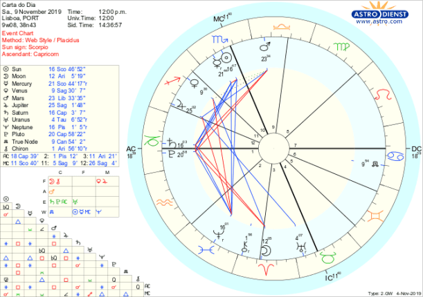 O que salva o fim-de-semana são os bons aspectos do Sol e Mercúrio em Escorpião a Saturno e a Plutão em Capricórnio. Isto quer dizer que temos a oportunidade de investir a fundo e a longo prazo na alteração das condições existentes que necessitam ser restruturadas. Como o Sol também faz trígono a Neptuno em Peixes há uma inspiração que nos guia e que não é difusa já que Neptuno também faz sextil a Saturno. Assim, a evitar tanto sábado como domingo é o impulso de agir sem pensar nas consequências ou se essa iniciativa faz sentido dentro de um plano maior das coisas. O instinto desta vez não é bom conselheiro…