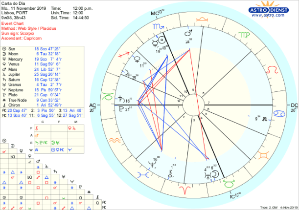 Estamos a chegar à Lua Cheia em Touro e a um momento de verdade sobre o que vale a pena guardar do passado e como fazer diferente no futuro. Tudo isto envolve não só nós próprios como as nossas relações com os outros, em particular do foro material mas também a reflexão sobre os valores que devem presidir a essas relações pessoais ou financeiras ou mesmo políticas. A Lua Cheia é amanhã, terça feira mas entra já hoje no signo de Touro onde faz pela manhã conjunção a Urano seguida de um sextil ao Nódulo Norte em Caranguejo. Isto dá o tom para a oposição na terça feira ao Sol conjunto a Mercúrio desde hoje em Escorpião. Inovar e seguir em frente na verdade dos sentimentos para atingir um novo patamar de segurança emocional é obrigatório face às surpresas, custos, rupturas ou conflito entre o que seria esperado e as perturbações que surgem repentinamente, dada a conjunção da Lua a Urano em Touro e sextil ao Nódulo Norte em Caranguejo. Rever toda a lógica de poder na partilha de bens ou situações de empréstimos ou divisão de controlos em casa, no trabalho ou na política é a outra condicionante do dia que perdura até à Lua Cheia de amanhã, dada a conjunção de Mercúrio retrogrado e do Sol em Escorpião, em sextil a Saturno e a Plutão em Capricórnio, aspecto que nos traz oportunidades para re-organizarmos a vida e as estruturas de que dependemos de forma mais racional, numa perspectiva de futuro. Nada disto é pacato: os aspectos da Lua criam tensão nervosa e os de Sol/Mercúrio levamos ao fundo das questões, forçados a tocar nas sombras para as iluminaram novos propósitos. Não podemos perder a cabeça fria e perseverar na re-definição de relações verdadeiras com os outros, pelo nossa parte e pelo que recebemos em troca, dado o sextil de Marte em Balança a Júpiter em Sagitário. A agenda é carregada mas pode ser cumprida com pragmatismo e sem medo das mudanças de rumo.