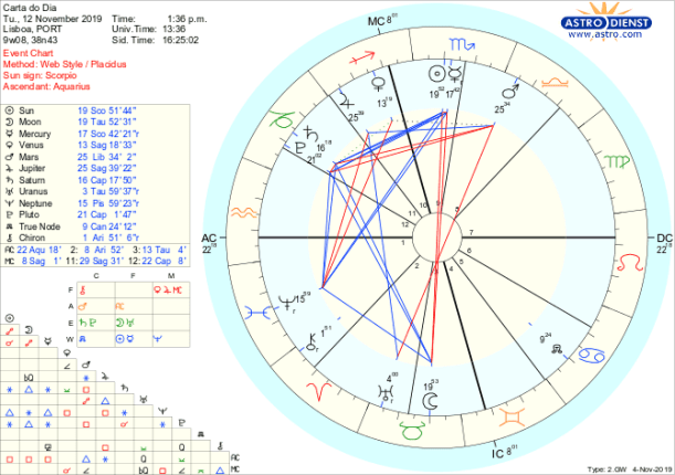 Agarrarmo-nos ao que temos e conhecemos ou sermos capazes de metamorfoses profundas no ter e haver, procurar a estabilidade ou transformar o que valorizamos, ser teimoso ou capaz de uma lógica e controlo de mudança são algumas das polaridades que temos de conciliar hoje nesta Lua Cheia deTouro oposta ao Sol em Escorpião, conjunto a Mercúrio, sextil a Saturno e Plutão em Capricórnio e trígono a Neptuno em Peixes. É como se houvesse um ideal que gostássemos de estruturar ou organizar para o futuro que implicasse ir ao fundo do que partilhamos com os outros, em particular na área material ou financeira e que nos confronta com o que se deseja possuir face ao que há que partilhar. A saída para isto passa pelo controlo de impulsos e de zanga e pelo esforço de revelar a si próprio e aos outros que é possível chegar a novos equilíbrio e novas organizações que satisfaçam em simultâneo a necessidade de mudar e a necessidade de estabilidade e materialidade e segurança emocional, familiar e doméstica dada a presença do Nódulo Norte em Caranguejo, regido pela Lua Cheia,. É o sextil de Marte em Balança a Júpiter em Sagitário que diz que todos temos de ganhar com a transformação e abertura ao futuro que tragam valor acrescentado às velhas estruturas partilhadas. Urano em Touro e Vénus em Sagitário são um apelo a esses novos valores que tragam expansão sem deixar de haver amor, esperança e bons relacionamentos. A ginástica emocional está na agenda desta Lua Cheia…