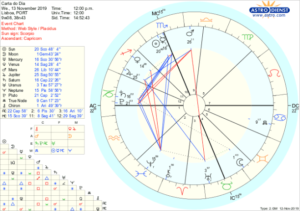 Quais são as opções? Como as comunicar? Interessa-nos tanto uma coisa como o seu oposto mas, de facto, não estamos a olhar para assuntos novos mas sim para questões antigas de partilha e de poder que é preciso resolver antes de podermos avançar para a criação de novas estruturas de vida. É a Lua em Gémeos que nos abre possibilidades, estimula tanto a curiosidade como a ambivalência mas são os aspectos que faz a outros planetas que condicionam as escolhas. Um sextil a Quiron lembra-nos que temos de encontrar o modo de resolver velhas feridas enquanto o bi-quintil a Marte nos diz que são precisas soluções criativas para lidar com os conflitos existentes nas relações pessoais ou financeiras e o sesquiquadrado a Saturno alerta para os bloqueios existentes derivados dos muros que criamos ou a que estamos sujeitos na organização e expressão das relações. Mercúrio retrógrado em Escorpião -onde também está o Sol -é o sinal do trabalho de revisão e correcção em curso em que há que descobrir novas lógicas de partilha ou de controlo de bens ou emoções ou ambos, em relações carregadas sentimentalmente. Só não ficamos exaustos nem deprimidos porque Vénus e Júpiter em Sagitário em aspecto a Neptuno em Peixes – que está em trígono a Mercúrio- nos permitem projectar e sonhar com uma Verdade maior em que o coração pode estar empenhado enquanto o resto for esforço mental e prático.