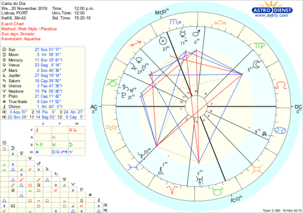 Hoje é um bom dia para analisar situações e arrumar assuntos, com sentido crítico, capacidade de inovação e vontade de transformar as condições existentes, como consequência de uma reflexão aprofundada sobre o que falta e há que fazer. Deve-se esta abertura e potencialmente bons resultados- que se extendem até amanhã- à presença da Lua em Virgem, em trígono a Urano em Touro, sextil a Marte e Mercúrio retrógrado em Escorpião. O que hoje pusermos em acção amanhã trará resultados práticos e metamorfoses reais com a Lua a fazer trígono a Saturno e a Plutão em Capricórnio. Há no entanto dificuldades derivadas da oposição da Lua a Neptuno com impactos externos que nos emocionam ou turvam a perspectiva mas em geral conseguimos ultrapassar essa influência e ver claro o que temos de fazer e transformar não só pelos bons apoios da Lua em Virgem como pelo seu regente Mercúrio, em trânsito em Escorpião, deixar de estar retrógrado a partir das 19 horas desta quarta feira, desbloqueando-se assim muitas das situações embrulhadas desde o início do mês.