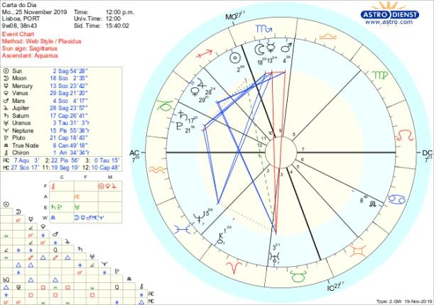 Tudo flui hoje para amanhã na Lua Nova podermos semear ideias para o futuro mas até lá há que acabar de limpar o terreno e preparar uma estratégia de expansão dos objectivos a cumprir e estruturar. Há comunicações sensíveis pela manhã em que medidos o controlo e a lógica de actuação com a Lua e Mercúrio conjuntos em Escorpião e de seguida começamos a ver claro as oportunidades de reformular e estruturar a organização de vida, quando a Lua faz sextilha a Saturno e a Plutão em Capricórnio, a apontarmos já para Janeiro quando estes dois planetas estiverem conjuntos e então sim entrarmos num novo ciclo. O Sol está em Sagitário, à espera da Lua amanhã, a animar o espírito com a promessa de um ciclo solar e lunar de abertura de horizontes, viagem, conhecimento, necessários à reformulação estrutural que se apronta para 2020. Hoje, e amanhã com a Lua, em quincúncio a Urano retrógrado em Touro, o Sol ou a nossa energia vital confronta-se com a tensão de inovar. Será que o que projectamos para o futuro é realmente inovador? Será que estamos mesmo a adoptar novos valores? Que temos ainda de corrigir nessa área atendendo a que Urano está retrógrado até Janeiro, só entrando directo quando Saturno e Plutão se conjugarem? Também hoje em vésperas da Lua Nova e com Venus, regente do Touro e Júpiter regente do Sagitário em sextil à Lua em Escorpião temos uma boa oportunidade para repensar os objectivos e a sua qualidade inovadora. Amanhã na Lua Nova Vénus sai de Sagitário para entrar em Capricórnio e o desejo de organizar as ideias vai lado a lado com as novas ideias que o ciclo lunar semeia. Há uma narrativa nos Céus e cada qual a traduz através do seu horóscopo…Marte em Escorpião já ultrapassou a oposição a Urano e a determinação em cortar a direito na vasta agenda de reformas a fazer sofre agora menos de irritabilidade e imprevistos.