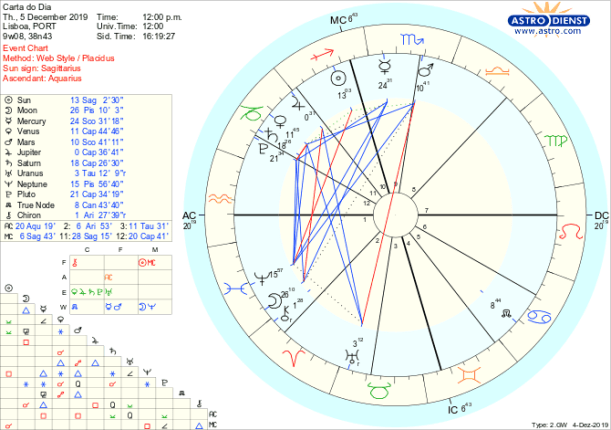 Na primeira metade do dia é com sensibilidade que conseguimos falar de coisas profundas ou que mexem com finanças ou poderes partilhados, já que é nessas áreas que temos de agir, ou tomar decisões. A Lua está em Peixes em trígono a Mercúrio em Escorpião o que facilita contactos para esses fins e Marte também em Escorpião em sextilha a Vénus e a Saturno em Capricórnio incita-nos à re-organização. Pela tarde a Lua ingressa em Carneiro onde faz conjunção a Quíron e quadratura a Júpiter em Capricórnio. Pode ser preciso perdoar o que não nos fizeram – ou o que não fizemos – e aconselhável alguma contenção nas iniciativas. De facto devemos mesmo poupar-nos, porque o Sol em Sagitário em quadratura a Neptuno em Peixes todo o resto da semana dificulta uma visão clara de objectivos e promove a difusão de energias. Assim, sentido prático, sensibilidade e um mínimo de projecção são os instrumentos para conseguir ter bons resultados nas tarefas em agenda até ao final da semana.