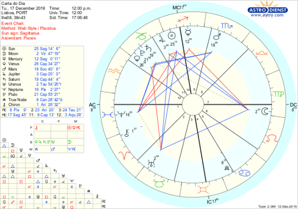 A Lua está em Virgem num grande trígono de Terra com Júpiter em Capricórnio e Urano em Touro que apela à concretização e desenvolvimento de algo de novo que sirva propósitos práticos. O Sol em Sagitário é o Fogo que acende as ideias de futuro que queremos concretizar e que também- apesar de fora de Signo participa já pela sua orbita de proximidade no trígono de Terra que nos vai fazer levar tudo a cabo, com imensa fluidez. A acção é comandada por Marte em Escorpião que nos leva ao fundo do que tem de ser mudado materialmente ou nas relações de poder e cujo sextil a Saturno e Plutão em Capricórnio abre oportunidades de realizar essa construção de novas estruturas de vida. Marte em trígono a Neptuno em Peixes reforça o Fogo da verdade do Sol em Sagitário com a inspiração da Água que alimenta o gesto decisivo de Marte. Em resumo, um dia óptimo para executarmos com precisão o que ambicionamos e sonhamos realizar. Bons trabalhos!