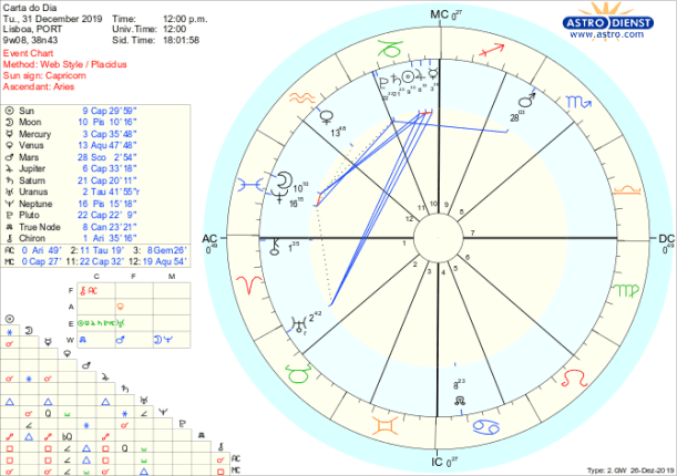 Não podia acabar melhor o ano de 2019! Estamos sob um Céu pacífico em que sextis e trígonos nos trazem oportunidades de viver as energias do dia, sem stress e com uma mistura simpática de organização, capacidade de inovar e inspiração e fantasia. Mercúrio, Júpiter, Sol, Saturno e Plutão em Capricórnio traduzem-se numa lógica de organização, desenvolvimento sustentado, seriedade, controlo e poder que poderiam só por si ser demasiado sérios para um dia que se quer de festa de adeus a uma década e expectativa para as mudanças que estão para vir. Mas a Lua em Peixes, conjunta a Neptuno e em sextil aos planetas em Capricórnio enche-nos dos sonhos do que podemos vir a concretizar, torna-nos hiper sensíveis não só ao que nos rodeia como a outros níveis de entendimento mais subtis, abrindo-nos as portas, pelo semi-sextil a Vénus em Aquário às relações com amigos, grupos, e em votos de paz ou outras manifestações de amor pelo universo em geral.O trigono de Mercúrio a Urano em Touro, tal como ontem, facilita organizarmos a nossa entrada em 2020 com um programa diferente do habitual. O único risco do dia- e da noite – é o das consequências dos estados alterados de consciência incutidos pela Lua em Peixes. Não os sentimos como excessos porque estamos mergulhados no sentir e o perigo é esse. Mas já se sabe…. se conduzir não beba etc…