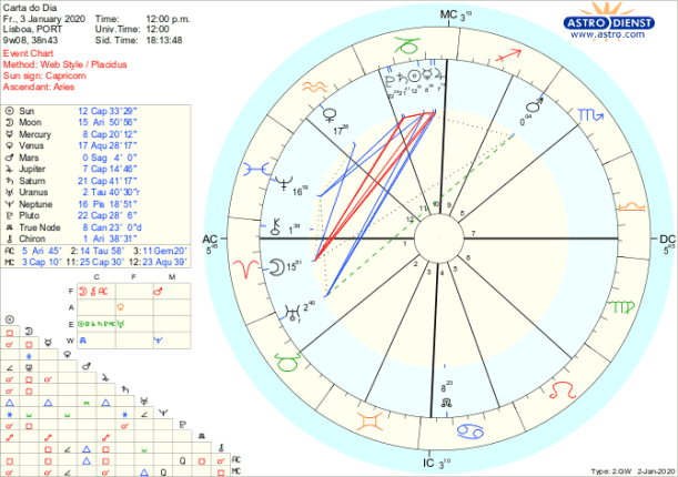 Tal como ontem há tensão no ar entre o que desejamos e o que podemos fazer, conflito esse que se desenrola num cenário em que Marte recém entrado em Sagitário nos leva a querer viajar, expandir conhecimentos e defender verdades mas como está quincúncio a Urano em Touro somos questionados pela validade ou diferença que faz o exercício da nossa vontade. Neste quadro, a Lua em trânsito em Carneiro – regida por Marte- leva-nos a ir atrás de impulsos que julgamos terem um impacto positivo e inovador – graças ao sextil a Vénus em Aquário- regido por Urano. Mas o resultado não é o esperado e a frustração ou conflito de interesses joga-se com a quadratura da Lua ao Sol, Saturno e Plutão em Capricórnio que pedem mudanças profundas e estruturadas e não golpes de fortuna e vontade. Com Mercúrio e Júpiter também em Capricórnio opostos ao NóduloNorte em Caranguejo, estamos a definir regras e a fazer planos de expansão para o futuro que dependem da melhor antevisão e organização possível. Nada pode ser deixado ao acaso nem ser feito com base na vontade cega. Melhor fazer com cuidado e amor pelo próximo…
