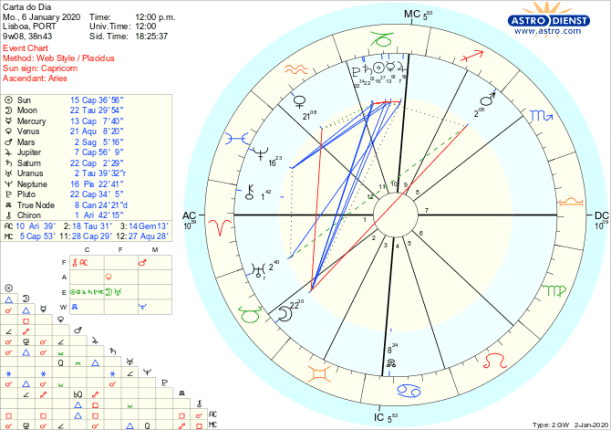 São os aspectos da Lua hoje a Saturno e Plutão que nos permitem concretizar preparativos de mudança, desde que não demos muita atenção ás questões de satisfação emocional/social levantadas pela quadratura da Lua a Vénus em Aquário. A irritabilidade também está exacerbada toda a semana com a possibilidade de atitudes ou acções explosivas dado o quincúncio de Marte em Sagitário a Urano em Touro. pela madrugada de amanhã a Lua entra em Gémeos e torna-se ainda mais difícil de manter a calma quando fizer oposição a Marte, um conflito entre a compreensão de várias opções possíveis e a vontade de seguir apenas um só caminho. Podemos no entanto continua a sonhar que estamos perante oportunidades de construir um mundo ideal. O problema está em que o mundo ideal de uns não é o mundo ideal de outros e o tempo não encoraja o equibrio das relações…