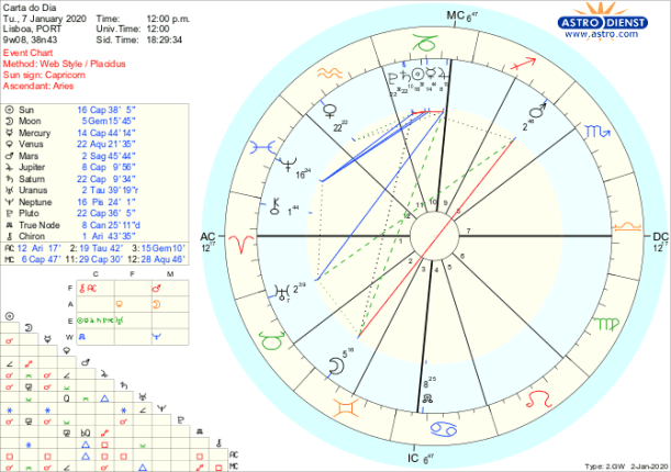 Os conflitos surgem hoje em várias frentes e a dificuldades está em manter um programa de acção com vista ao restabelecimento de uma nova ordem das coisas, em casa, em familia, na política. A Lua em Gémeos oposta a Marte em Sagitário que está em quincúncio a Urano em Touro é prenúncio de instabilidade e incidentes surpresas que abalam a desejada reformulação calculada da ordem, com Júpiter, Mercúrio, Sol, Saturno e Plutão em Capricórnio a pesarem forte na necessidade de contenção e sustentabilidade em qualquer lógica de poder ou de transformação das estruturas de vida existentes. Esta é a semana do ano de maior tensão astral, com um eclipse da Lua Cheia oposta ao Sol conjunto a Saturno e Plutão no dia 10, com Urano a entrar directo a 12 em Touro assim como o planetóide do caos, Eris, a entrar também directo em Carneiro, já hoje.