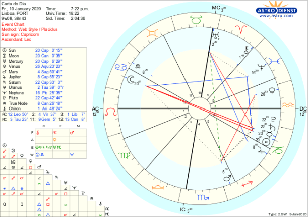Há como uma guerra entre o passado e o futuro e é possível sentirmo-nos ameaçados pela força destas energias que não controlamos e nos forçam a ir em direcções novas, mesmo sem que saibamos bem quais são. É um ano novo, uma década nova, uma era nova que se desenha e que temos de abraçar o melhor possível, na área de vida que corresponda à casa onde temos Capricórnio no horóscopo individual. Há outras forças radicais que se revelam hoje com a Urano estacionário em véspera de entrar directo em Touro, e Éris, o planetóide da discórdia, directo a 23 graus de Carneiro, em quadratura à Lua Cheia e á conjunção Sol, Saturno, Plutão.