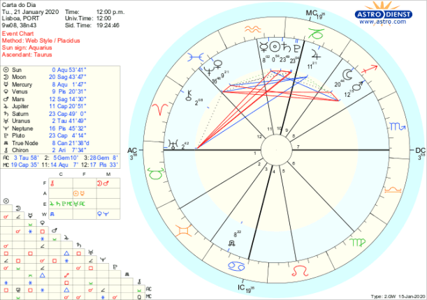 Com a entrada do Sol em Aquário é o mundo que nos interessa e com ele que dialogamos para identificar o que de novo nos pode trazer que corresponda aos ideais sonhados. Mercúrio em Aquário e Urano seu regente em Touro falam-nos e mostram-nos o novo e diferente onde temos agora de descobrir o nosso lugar. O pensamento é positivo, as aspirações grandes e o sentido prático está mobilizado para a concretização com Marte e a Lua em Sagitário, esta em sextil a Saturno e Plutão em Capricórnio. É Júpiter em Capricórnio em sextil a Vénus e a Neptuno em Peixes que dá o entusiasmo e engenho para alcançarmos os sonhos. Podemos hoje pensar grande, longe e dar os passos certos.