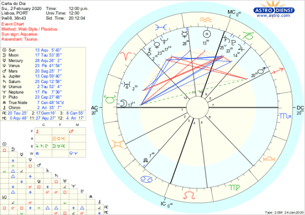 O fim-de-semana de arranque de Fevereiro começa com sobressaltos… Esperar o inesperado e agir bruscamente ou ser sujeito a alterações de rotina é o mínimo que podemos esperar nestes dois dias de rupturas e re-avaliação do que vai contar para futuro… É claramente tempo para acordar para novos valores. O mês começa com a Lua em Touro conjunta a Urano e quadrado ao Sol em Aquário, aspectos que implicam saltos de humor, alterações de valores e tensão quando ao nosso lugar no mundo – é um Brexit à dimensão de cada um….