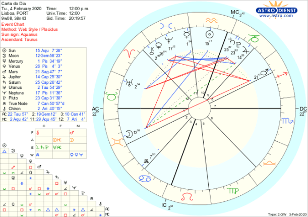 As comunicações fluem mas há ameaças de tensão quando exprimimos certezas duvidosas. A Lua e o Sol está num trígono de Ar entre Gémeos e Aquário mas a Lua avança para uma oposição a Marte em Sagitário que está em quadratura a Neptuno em Peixes. A presença de Mercúrio, Neptuno e Vénus em Peixes estimula uma lógica sensível, empática, idealista o que é um pouco contraditório com a frieza que vem do Sol e Lua em signos de Ar e em que, neste caso, o que conta é pertencermos este ou aquele grupo e todas as possibilidades que daí podem advir. Ainda para mais, uma quadratura pela tarde da Lua a Neptuno baralha ainda mais a avaliação do caminho a tomar. Resta-nos como guia do dia o sextil de Vénus a Plutão e a Saturno em Capricórnio: tem de haver compaixão e generosidade se queremos organizar a vida de outra maneira. Sem isso não inovamos nem ficamos a saber se devemos estar onde julgamos que queremos estar.