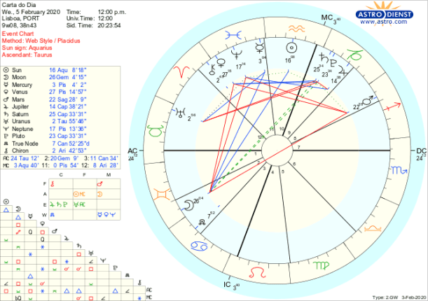 É só pelo final do dia que começamos a sentir mais conforto nas nossas opções e mais facilidade em exprimir o que nos vai no íntimo quando a Lua sair de Gémeos e da quadratura a Vénus em Peixes e entrar em Caranguejo em trígono a Mercúrio em Peixes e em sextil a Urano em Touro. Assim, até às 19 horas GMTé para a esquerda e para a direita em afazeres e comunicações que nos desdobramos cheios de boa vontade mas com poucos resultados não valendo muito a pena dar grande importância a qualquer frustração já que o importante vem mais tarde, quando com a Lua já em Caranguejo e com melhores aspectos nos permite ir ao fundo de nós mesmos e encontrar sem sombra das dúvidas que nos assolaram de manhã, a via para com sensibilidade e inteligência fazermos o que há a fazer que nos dê o sentimento de pertença a um colectivo onde possamos brilhar – com o Sol em Aquário – e que queremos transformar profundamente para melhor- com Júpiter, Plutão e Saturno em Capricórnio, estes dois últimos em sextil a Vénus em Peixes. É um dia para analisar friamente possibilidades que a partir da noite podemos escolher e abraçar com sensibilidade e sentido de futuro.