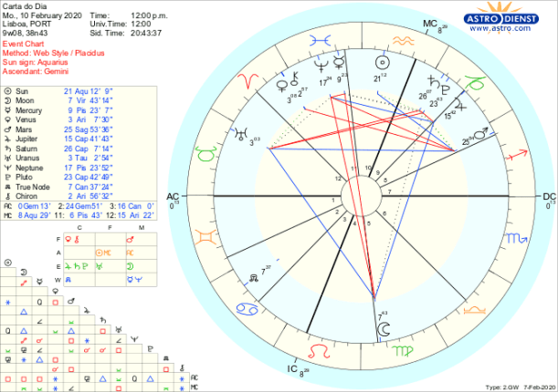 O dia pede total atenção aos detalhes mas a tendência para a dispersão é forte. Começa por termos dificuldade em exprimir claramente o nosso propósito, com Mercúrio em Peixes em oposição à Lua em Virgem. É a Lua neste signo que exige cuidado com os pormenores de organização e serviço, mas também acentua o risco de só olhamos para as folhas e não vermos floresta. É preciso fazer listas mas também dar um título ao rol de afazeres.Depois da oposição a Mercúrio em Peixes em que o que dizemos ou planeamos pode estar longe da exigência de clareza de detalhe, a Lua faz oposição a Neptuno o que pode ser muito bom para a inspiração artística mas dificulta uma visão realista dos dados e traz conflito de ideias com uma quadratura simultânea da Lua a Marte em Sagitário. O que resolve tudo e traz no final bons resultados e assuntos arrumados é o trígono da Lua a Plutão e a Saturno em Capricórnio. É um arranque de semana em que o sentido prático deve prevalecer sobre todas as diversões da mente para conseguirmos levar até ao fim o trabalho em agenda, vendo em simultâneo as folhas e as arvores e as arvores e a floresta e o nosso próprio lugar na ideia de mundo que queremos construir, com o Sol em Aquário em sextil a Marte em Sagitário.