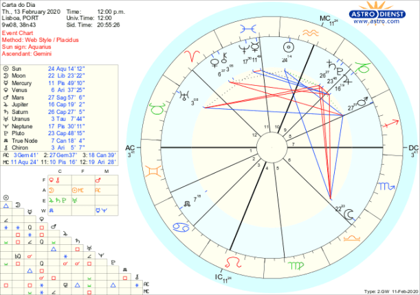 Os grandes projectos não se fazem sem grandes tensões hoje que o Sol e a Lua estão num trígono de Ar de Aquário para Balança mas a Lua faz quadratura a Plutão e Saturno em Capricórnio. É preciso no entanto estar pronto para defender as ideias que nos guiam ou nos apaixonam com a Lua em sextil a Marte em Sagitário que rege Vénus em Carneiro e cujo trígono a Urano em Touro permite um pensamento original, a construção de uma nova realidade, valores inovadores de impacto colectivo já que Urano rege o Sol em Aquário. Só os aspectos da Lua aos planetas lentos em Capricórnio perturba a fluidez do diálogo necessário à concretização desses grandes projectos porque promove a compulsividade, a desconfiança e o sentimento de isolamento emocional. Assim, é preciso hoje ser flexível e ter sentido prático. Vénus em quadratura aos Nódulos também aconselha a não irmos atrás de impulsos mas dedicarmo-nos sim ao que nos vai dar satisfação e segurança a longo prazo.