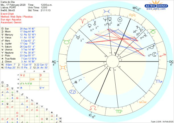 Nada é claro neste arranque de semana apesar do empenho que pomos para que as coisas aconteçam de forma diferente. E todo o cuidado é pouco em verificar a informação a que acedemos ou papéis a tratar. A Lua em Sagitário estimula grandes expectativas mas uma quadratura a Mercúrio e Neptuno em Peixes não permite ideias claras sobre o que de grande Júpiter regente de Sagitário e Peixes, em trânsito em Capricórnio, nos apela a construir. Apesar da falta de clareza, o empenho é grande para mudar a ordem das coisas para outra diferente e inovadora. A Lua está em trígono a Vénus em Carneiro que não quer pensar antes de agir e Marte seu regente acaba de entrar em Capricórnio e faz durante toda a semana trígono a Urano em Touro. Assim, por um lado temos a gana de acção e inovação mas por outro não há plano ou ideias claras a seguir. Tudo se complica ainda mais e todas as verificações extra se tornam necessárias porque Mercúrio entra hoje retrógrado em Peixes, até ao dia 11 de Março, chegando mesmo aos últimos graus de Aquário e só regressando a Peixes no dia 16 de Março e ao grau onde se encontra hoje no final de Março. Temos assim um longo período pela frente em que quanto maior for a atenção, verificação, antecipação, revisão, cuidados a ter, menores são as possibilidades de atrasos, erros, confusões, enganar e ser enganado. Só devemos deitar mão a obra seguros de que tudo está em ordem para o fazermos.
