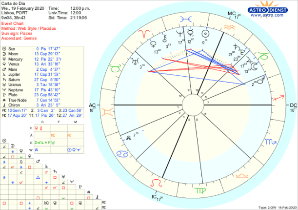 Continuamos a beneficiar da possibilidade de levar a cabo muitas tarefas pendentes ou ainda necessárias a completar o ciclo anual solar dentro de um mês quando o Sol entrar em Carneiro no Equinócio de Março. Os astros estão alinhados de forma a facilitar acções concretas, a execução de projectos de inovação ou renovação e para além dos resultados fáceis de obter com esforço diligente podemos até contar com golpes de sorte! A entrada do Sol hoje em Peixes onde se encontram também Mercúrio retrógrado e Neptuno suaviza todas as emoções porque naturalmente nos põe em contacto com algo maior, mais profundo ou universal que reduz as tensões do particular. Mas não vamos ficar a “navegar na mayonnaise”! Um semi-sextil do Sol a Marte em Capricórnio que está em trígono a Urano é o aspecto que desde ontem e até ao final da semana nos permite concretizar sonhos ou materializar com sensibilidade tarefas que a todos beneficiam. O bónus está também disponível toda a semana graças ao sextil entre Júpiter em Capricórnio – a que hoje se une a Lua – e Neptuno em Peixes. Imaginar e fazer acontecer é mais do que possível, é uma realidade ao dispôr dessa ambição.