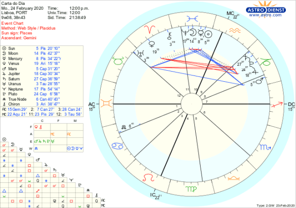 A Lua Nova de ontem em Peixes abriu-nos o caminho para o que desde hoje estamos prontos a fazer com outro estado de alma, mas há que ter atenção em bem gerir sonhos e concretização para nos nos perdermos em fantasias nem cair no exercício cego da vontade. Hoje a Lua continua em Peixes e faz conjunção a Neptuno pela tarde antes de iniciar uma série de sextis a Júpiter, Plutão e Saturno em Capricórnio, as energias de transformação da matéria e da ordem das coisas que activamos com empenho e sentido do que é certo fazer graças ao sextil de Marte em Capricórnio ao Sol em Peixes. Assim, começamos a semana imbuídos de boas ideias, boa vontade e determinação em pôr fim a todos os processos que se arrastam e nos arrasam mas que temos de concluir a começar por termos sobre eles uma nova consciência. Esta mudança de compreensão do que há que mudar agora iniciou-se com ar etrogradação de Mercúrio no passado dia 18. Esta semana temos um ponto de viragem fundamental quando Mercúrio fizer conjunção ao Sol, quarta, quinta e sexta feira, sempre em sextil a Marte o que implica que o coração e a acção podem agir em uníssono, encontradas as oportunidades de melhorar as estruturas de vida. Tudo isto nos vai fazer sentir melhor porque estamos a fortalecer as bases de segurança emocional,doméstica e familiar para o futuro, graças ao trígono, toda a semana, do Sol em Peixes ao Nódulo Norte em Caranguejo.