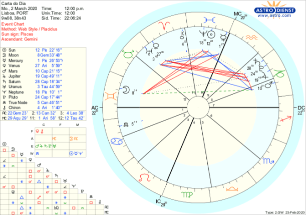 A semana começa com alguma tensão nas comunicações ou negócios principalmente porque os dados não são muito claros já que sensibilidade e lógica multiplicam as opções para resolver assuntos pendentes, com Mercúrio retrógrado, Sol e Neptuno em Peixes e a Lua em Gémeos a fazer-lhes quadraturas sucessivas. Por isso, melhor não querer nada em definitivo e também porque, com Vénus em Carneiro em quadratura Saturno em Capricórnio, qualquer certeza de desejo choca com os limites do pragmatismo e da ordem estabelecida. No entanto, estes aspectos, bem geridos também nos permitem avaliar um grande número de dados e testá-los face ao que idealizamos realizar. Apenas é necessário em permanência durante o dia fazer esforços de grande seriedade e, sem pressas, gerir expectativas e concretização, escolhendo palavras e refreando impulsos. A confirmar que não devemos querer fazer nada, só por fazer, está a quadratura de Quiron em Carneiro ao Nódulo Norte em Caranguejo: a satisfação das necessidades de segurança não vem da acção mas sim da avaliação o mais correcta possível dos dados em cima da mesa.