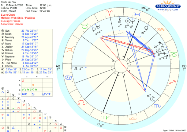 Hoje é um dia ideal para fazermos mudanças profundas na vida, na forma como nos organizamos ou por causa das estruturas de que dependemos. Isto acontece animado por alguma causa, ideal, espírito do tempo sinalizado pela conjunção de Sol e Neptuno em Peixes que procuramos, com controlo materializar pragmaticamente, com a Lua em Escorpião em sextis sucessivos a Marte, Júpiter Plutão e Saturno em Capricórnio – que estão em sextil ao Sol e a Neptuno que por sua vez recebem um trígono da Lua. Há muita emoção envolvida neste processo dada a presença de Sol, Neptuno e Lua em signos de Água, assim como o Nódulo Norte. Mas essas emoções têm de ser transformadas em algo de concreto, construtivo e inovador. Temos de adoptar novos hábitos, novos gostos, novos valores, com Vénus ainda conjunta a Urano em Touro e o sextil deste ao Nódulo Norte é o garante de que pensar e valorizar a diferença é o que nos trará maior segurança de futuro.