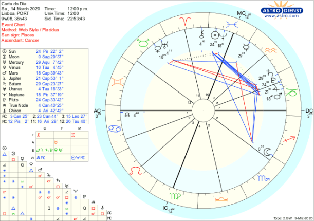 Procuramos a verdade este fim-de-semana mas a situação não é clara. Apesar disso queremos e podemos agir a favor de causas maiores.Tanto sábado como domingo a Lua está em Sagitário de onde faz aspectos tensos a Mercúrio em Aquário e a Neptuno e Sol em Peixes. São aspectos que provocam tensão entre o que será lógico fazer e o desejo de liberdade e expansão e também entre o que precisamos e o que queremos, sendo mesmo confuso saber como resolver estes conflitos internos. Acabamos por optar por agir seguindo princípios estabelecidos que sirvam mais do que a nós próprios, com o sextil de Marte em Capricórnio a Neptuno em Peixes e de Plutão em Capricórnio ao Sol em Peixes. Este último sextil é potente e dá-nos uma força imensa, quase obsessiva para alcançar objectivos. O importante de facto é não ligarmosmuito às contrariedades emocionais e dedicarmo-nos sim a pôr em prática medidas e estruturas que correspondam a princípios universais, de sensibilidade e empatia. Dentro de uma semana, quando o Sol entrar em Carneiro, Saturno entrar em Aquário e Marte, Júpiter e Plutão fizerem conjunção em Aquário teremos um solstício complexo com grandes alterações na ordem colectiva, limites, imposições e a sujeição a forças maiores. Tudo isto já faz parte do cenário que estamos a viver por causa do coronavírus. Por isso e até ao solstício -quando será provável uma radicalização da situação, – temos, desde já que não perder tempo com considerações emocionais ou dúvidas existenciais mas sim agir pragmaticamente para, com o Nódulo Norte em Caranguejo, encontrarmos, no “ninho” a nova segurança.