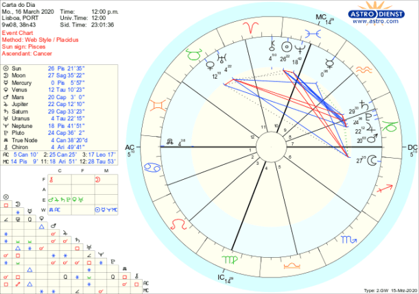 Esta é uma semana chave no processo de restruturação da ordem de vida pessoal e colectiva desde a conjunção de Saturno a Plutão em Capricórnio no início de Janeiro. O Sol vai entrar em Carneiro no Equinócio sexta feira 20, Marte, Júpiter e Plutão fazem conjunção em Capricórnio de dia 20 até ao fim do mês e Saturno entra em Aquário no domingo 22, em quadratura a Urano em Touro. São vários assim os indicadores de restrições, limites, imposições autoritárias, regras apertadas, fim de liberdades, a negação da liberdade da globalização…a quarentena pessoal e colectiva que se pode estender bem para além do que desejamos.