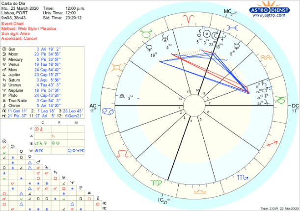 Esta aridez de informação corresponde ao período que vai da Lua Nova de amanhã em Carneiro até à Lua Cheia de Balança no dia 8 de Abril. São 16 dias intensos, com aspectos de enorme tensão por mais que queiramos ver o lado positivo. Este é sempre a possibilidade de navegarmos estas marés altas numa Arca de bons propósitos de futuro mas não deixamos de estar sujeitos a vagas dramáticas que apesar de ocorrem nos signos transpessoais Capricórnio e Aquário têm necessariamente impacto nas nossas vidas pessoais, como imposições externas, ou como o “Céu que nos cai em cima da cabeça”.