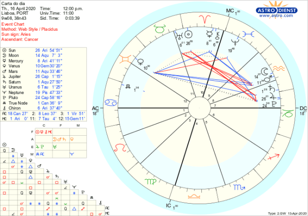 Assim, hoje, pelos aspectos do Sol continuamos tentados a exercer o nosso velho individualismo lutando sem sucesso contra restrições e regras mas, pela conjunção da Lua a Marte em Aquário e seu trígono a Vénus em Gémeos, há um outro impulso autoritário, de eliminação das restrições, aberto no entanto a várias soluções, dada a ordem das coisas. A síntese, para quem a fizer, está na escolha de comportamentos individuais que se integrem no interesse colectivo. Só essas escolhas vingam no quadro restritivo desenhado pela presença de todos os planetas do sistema posicionados entre o Nódulo Norte e o Nódulo Sul da Lua. Na Lua Nova dia 23 abre-se outro capítulo…