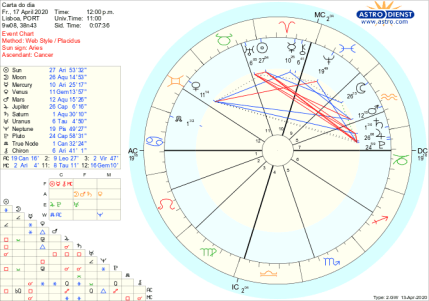Hoje é um dia mais simpático que os outros desta semana…Pela manhã a Lua ainda em Aquário faz um sextil ao Sol em Carneiro e conseguimos abrir-nos ao mundo com menos tensão do que já se tornou hábito.