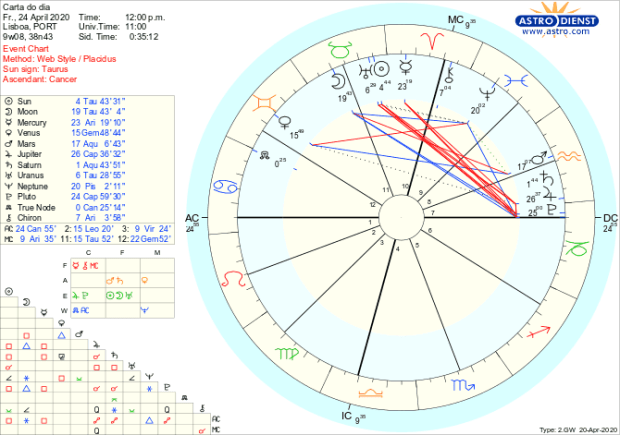 Assim, todo o cuidado é pouco para não falarmos sem reflectirmos no peso dessas palavras e na necessidade de ouvir as dúvidas que os outros possam ter, simbolizados por Venus, regente da Balança a que Mercúrio se opõe, em trânsito em Gémeos que Mercúrio rege. A abertura aos outros e aos novos valores é a chave de sobrevivência. O Sol, a nossa energia vital, a caminho de uma conjunção dentro de dias a Urano é um apelo a largar amarras e abraçar o – ainda- desconhecido.